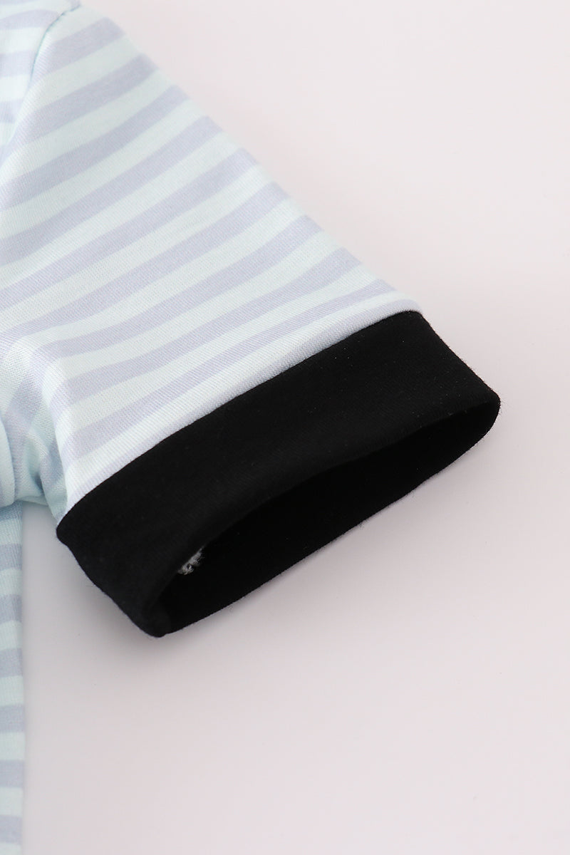 Celebrate Halloween in style with this playful blue romper featuring charming spider embroidery and bold stripes. Perfect for festive fun, its comfortable fit lets little ones move freely while showing off spooky-cute vibes. Ideal for parties or trick-or-treating, this romper adds a touch of whimsy to any Halloween outfit.