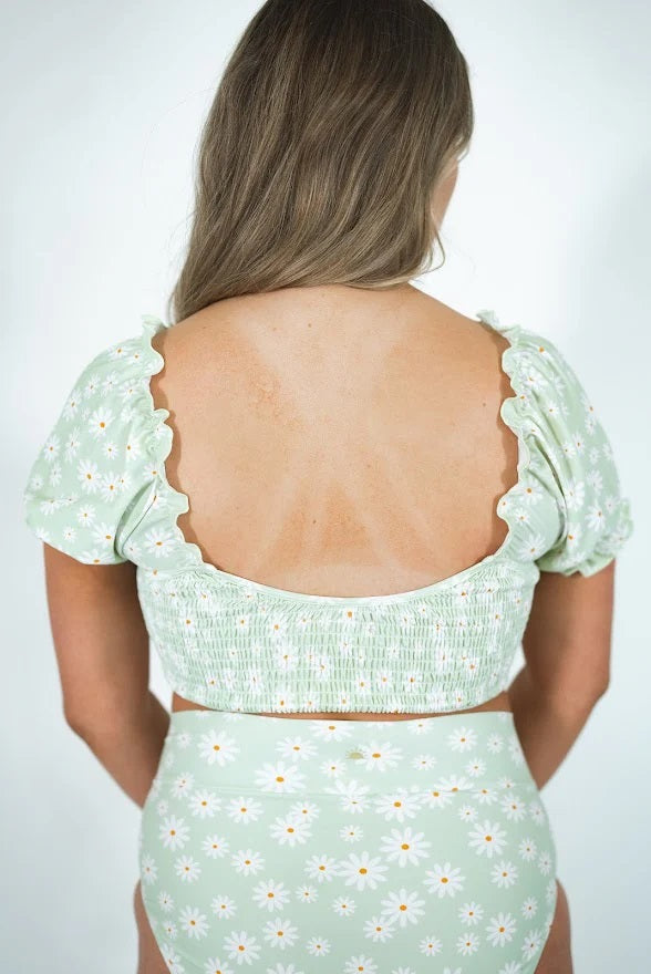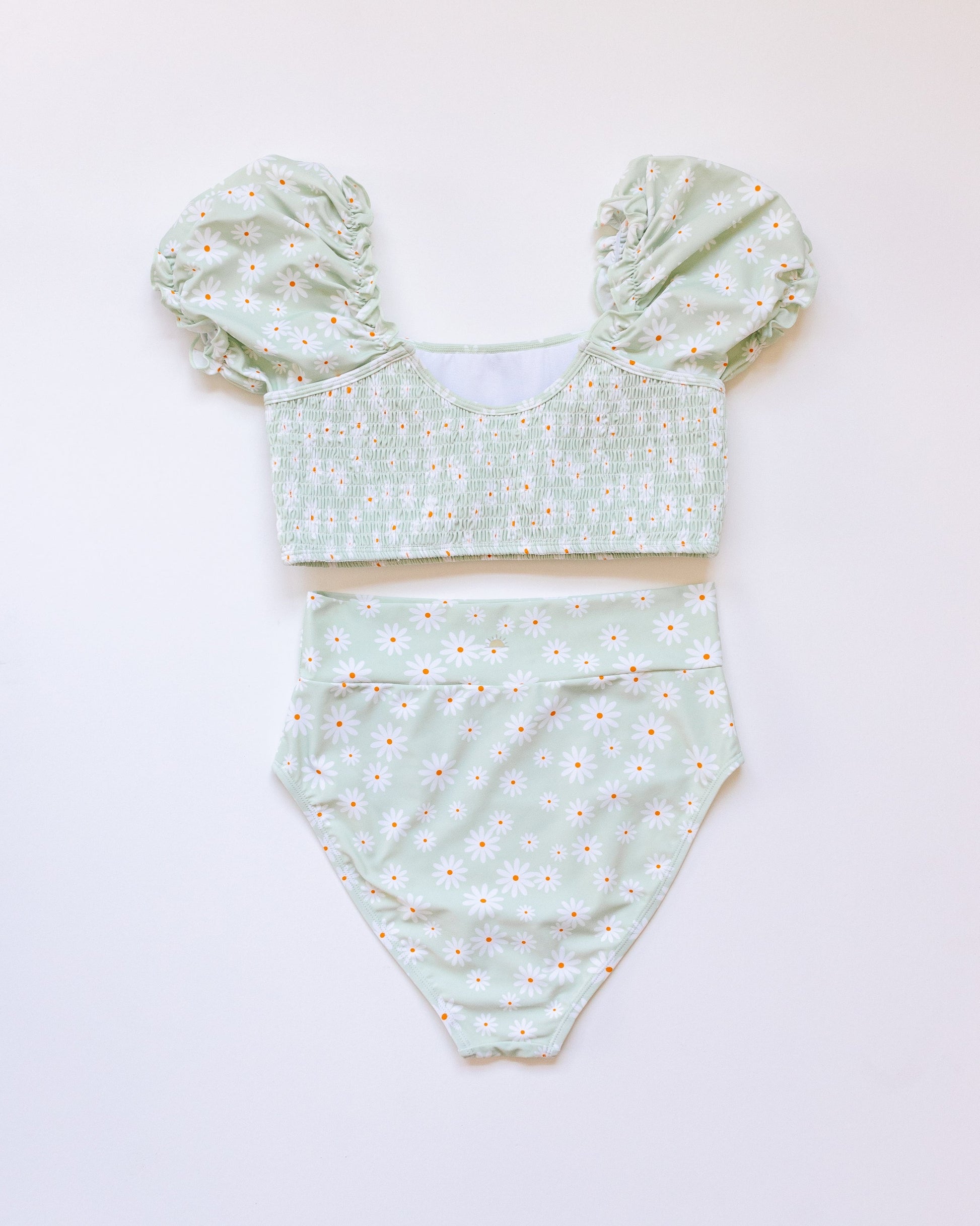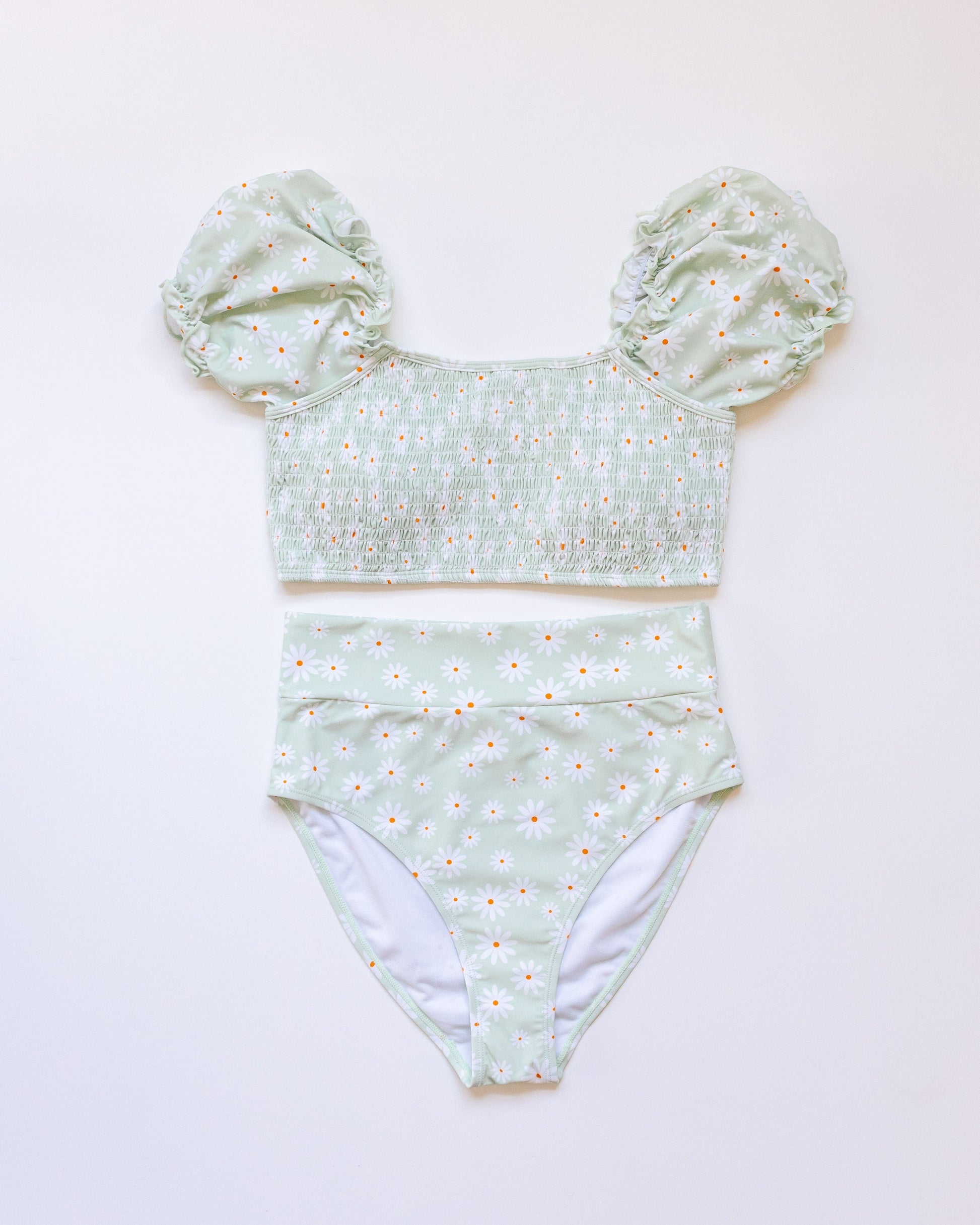 Get ready for some fun in the sun with our Daisy print smocked bikini 2pc women swimsuit! This playful swimsuit features a cute daisy print and a smocked design for a comfortable fit. Perfect for a day at the beach or pool, this swimsuit will have you feeling cute and confident all summer long.