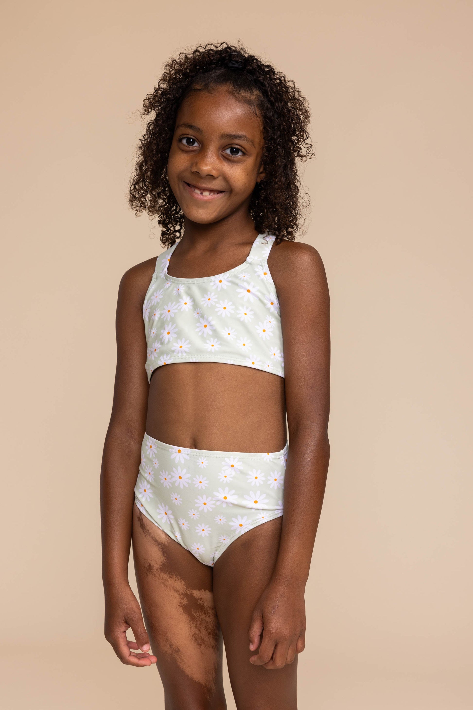 Make a splash with this adorable green daisy print 2pc girl swimsuit! Designed with a playful print and two-piece style, your little one will be the cutest swimmer at the pool or beach. Perfect for sunny days and building sandcastles. (Warning: may cause excessive "awws" and beach envy!)