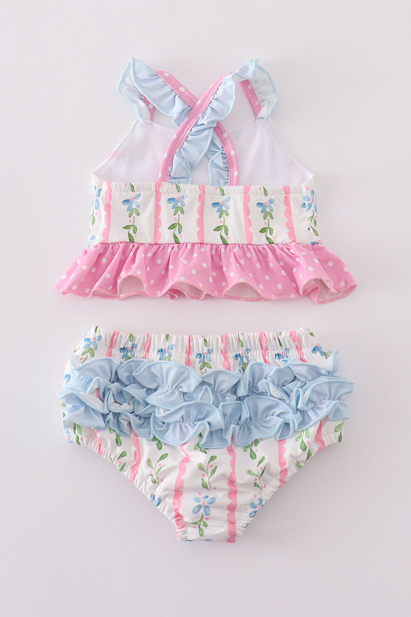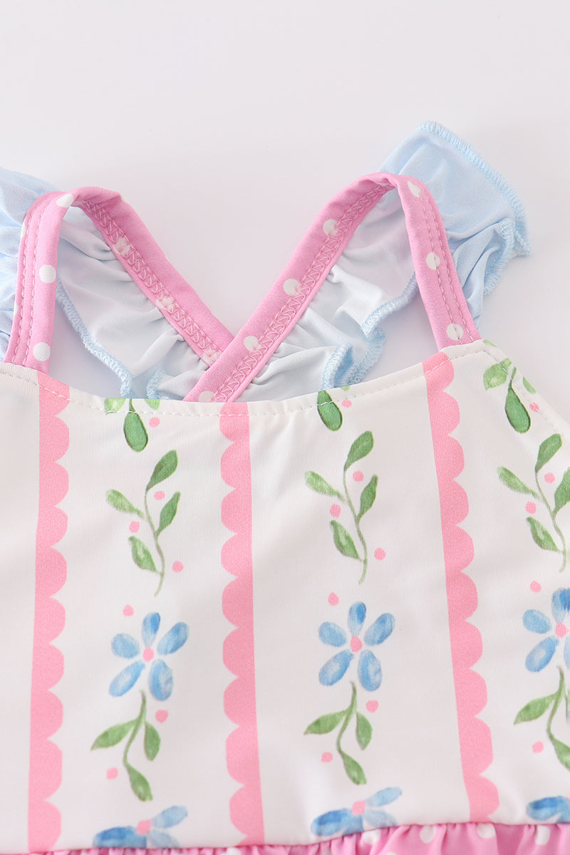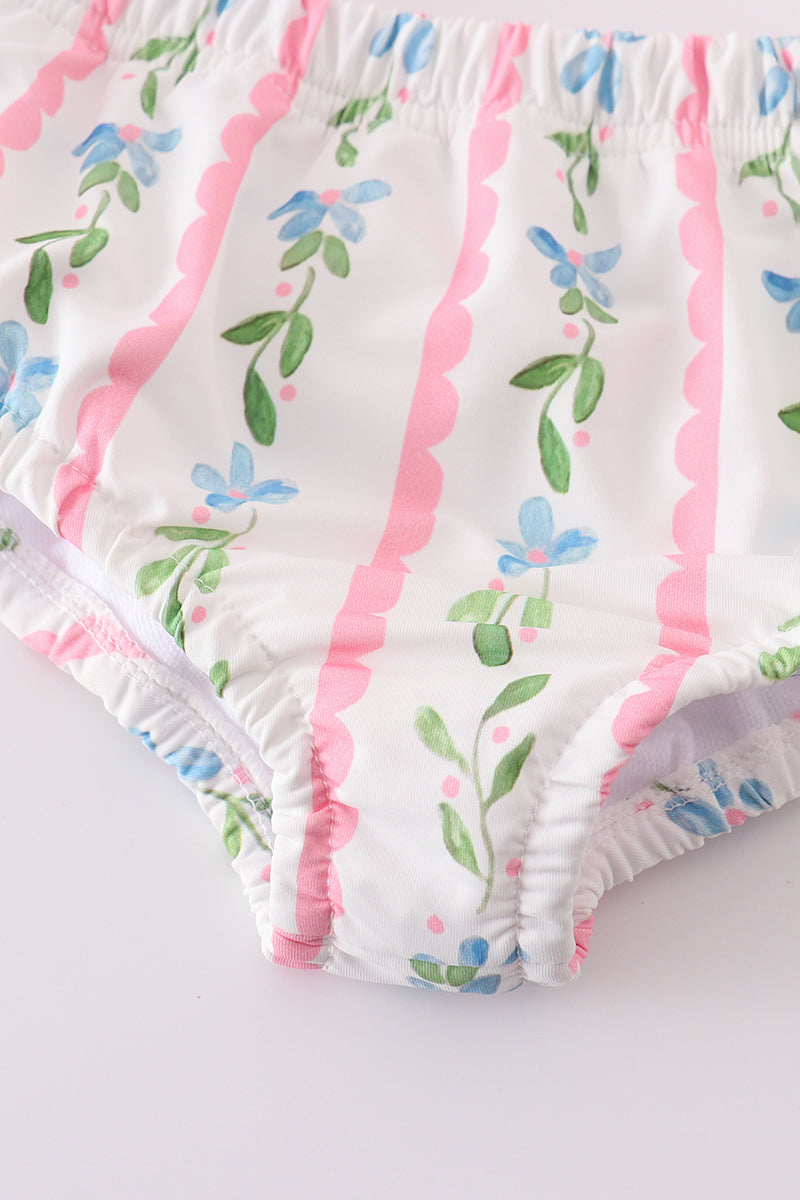 Make a splash with our Pink Floral 2pc Ruffle Swimsuit for girls! This adorable swimsuit features a playful pink floral print and stylish ruffle detailing. Perfect for days spent at the pool or beach, your little one will look cute and confident in our swimsuit.