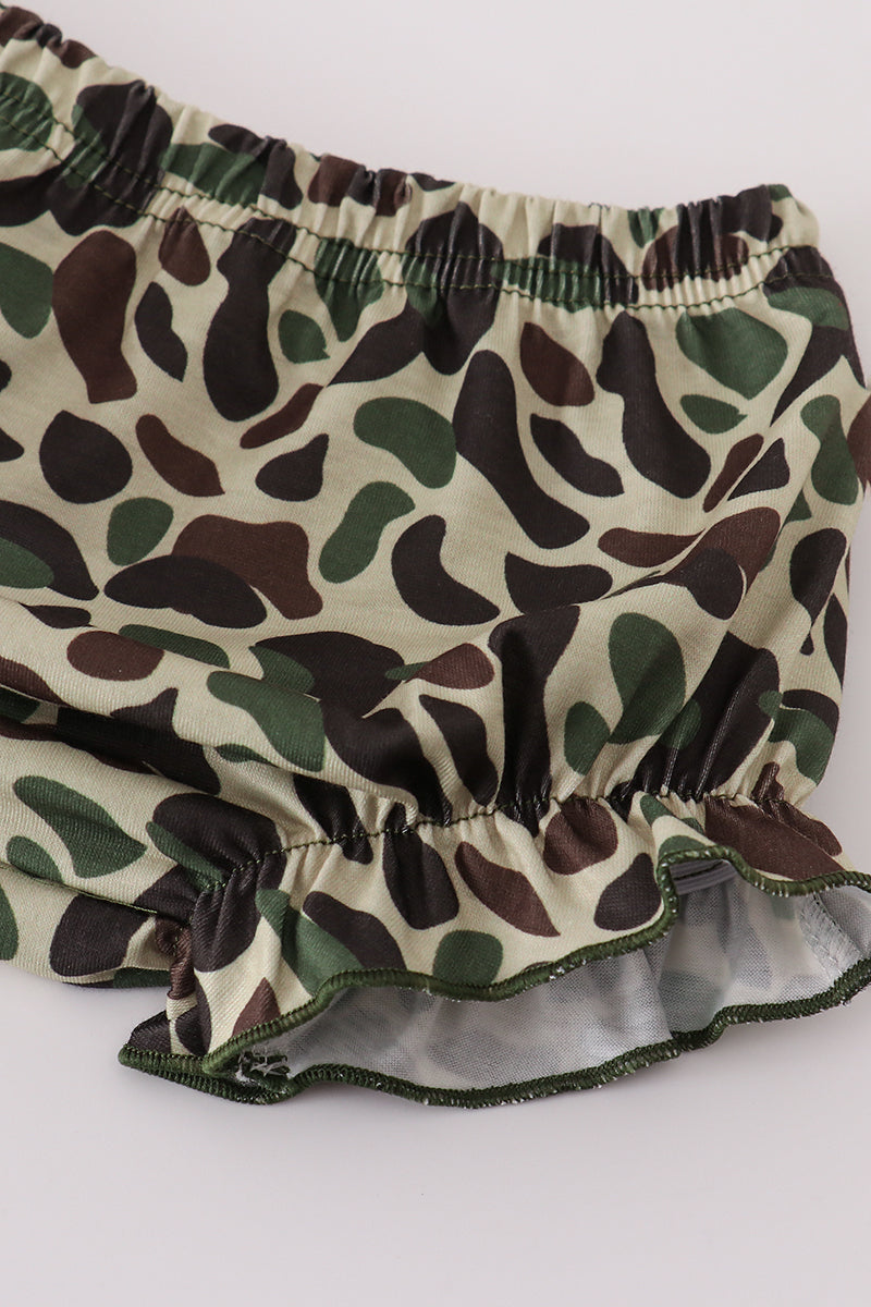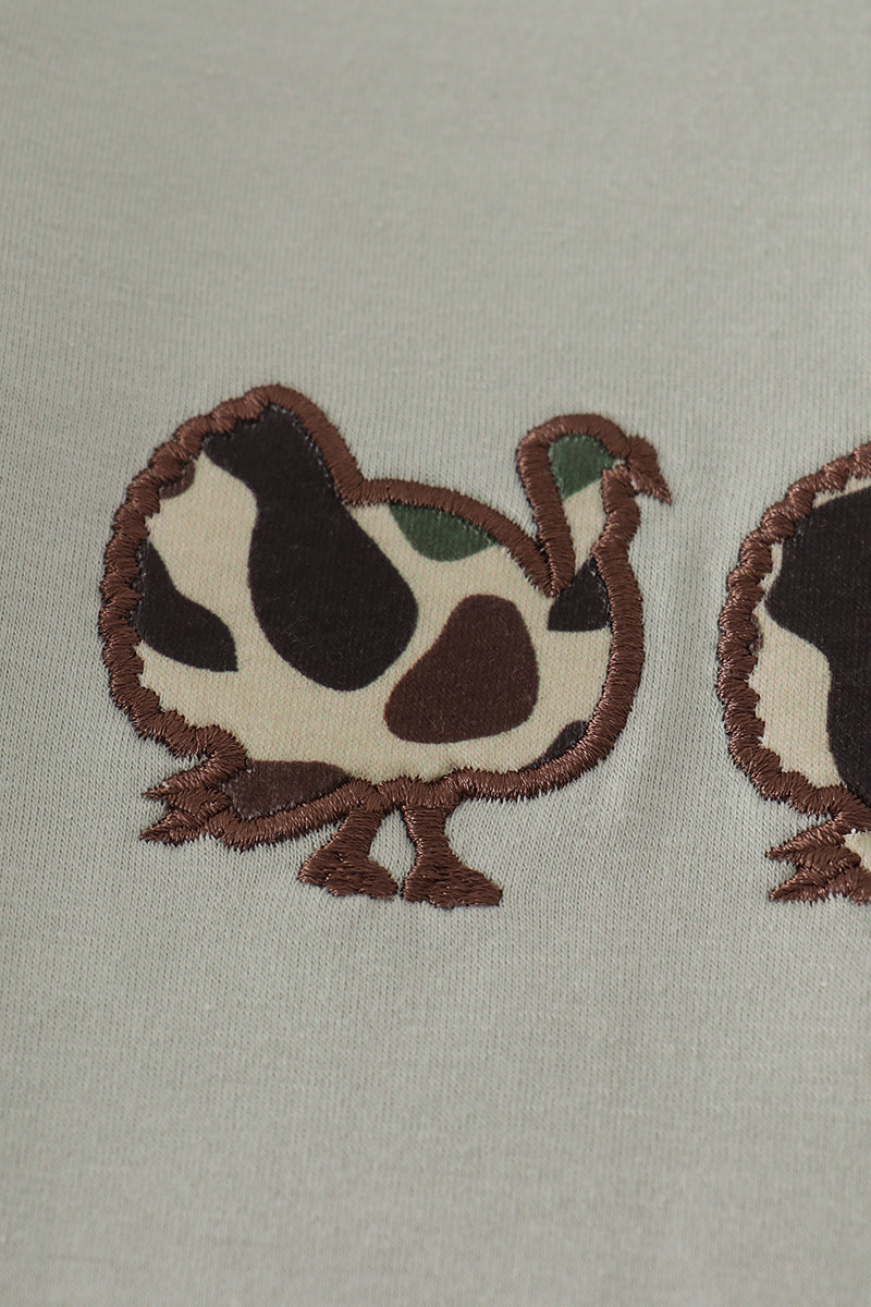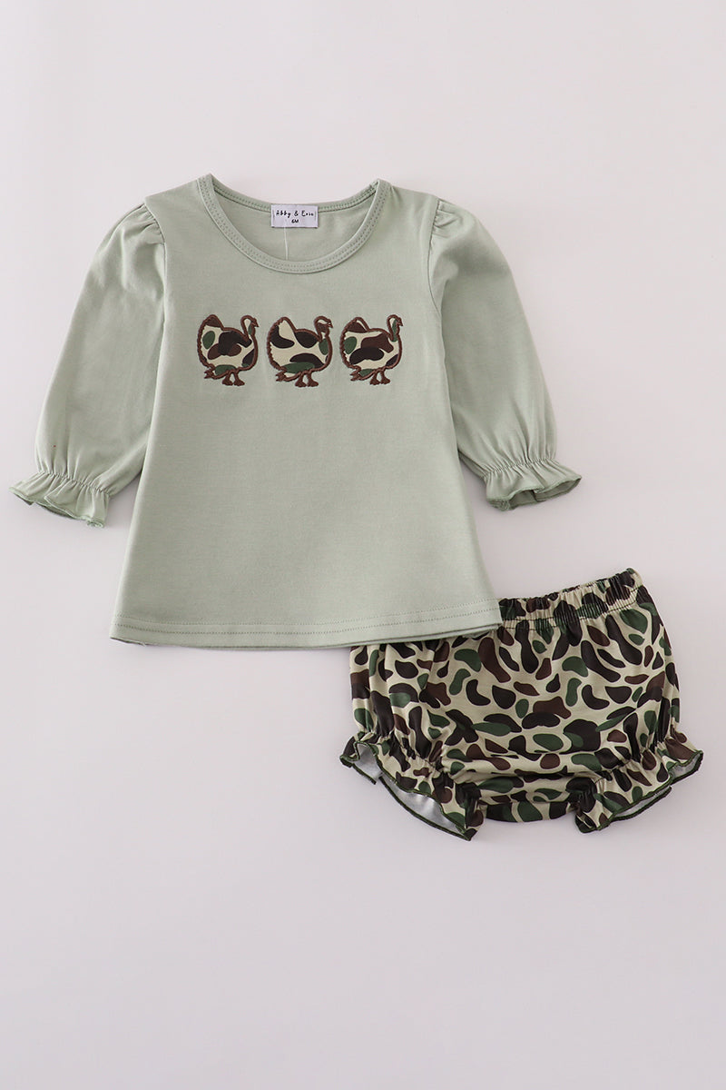 Dress your little one in festive fun with this Sage Camouflage Turkey Applique Bloomer Set. Featuring a charming turkey applique on a soft sage camouflage background, this set combines comfort and cuteness perfectly. Ideal for playful days and holiday gatherings, it adds a touch of whimsy to any outfit while keeping your child cozy and stylish.