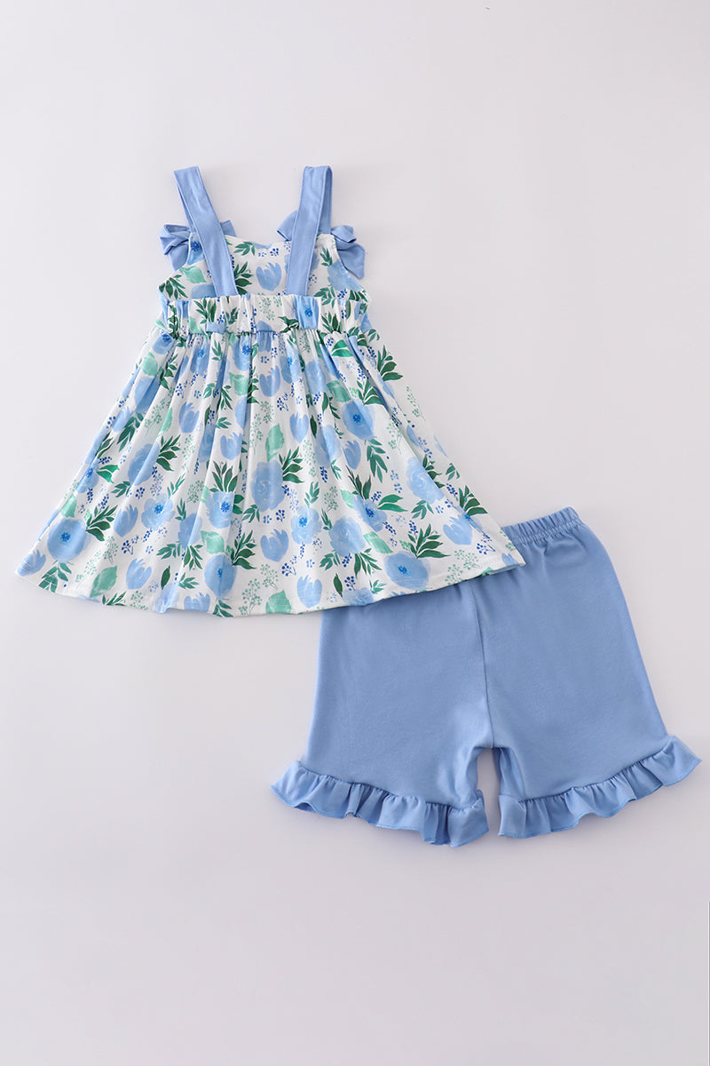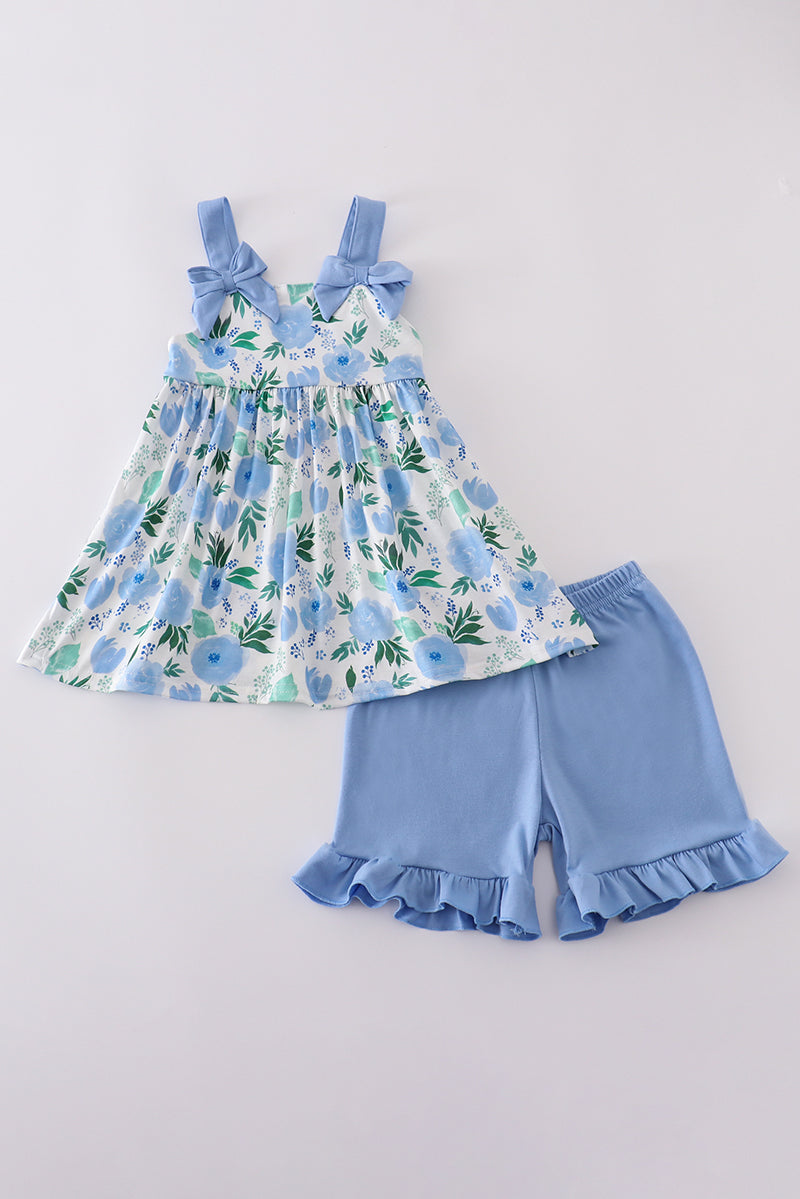 Unleash your little one's playful spirit with our Tranquil garden print bow girl set. Featuring a charming garden print and cute bow accents, this set adds a touch of whimsy to any outfit. Perfect for any occasion, give your child the gift of comfort and style. (2 exclamation points)